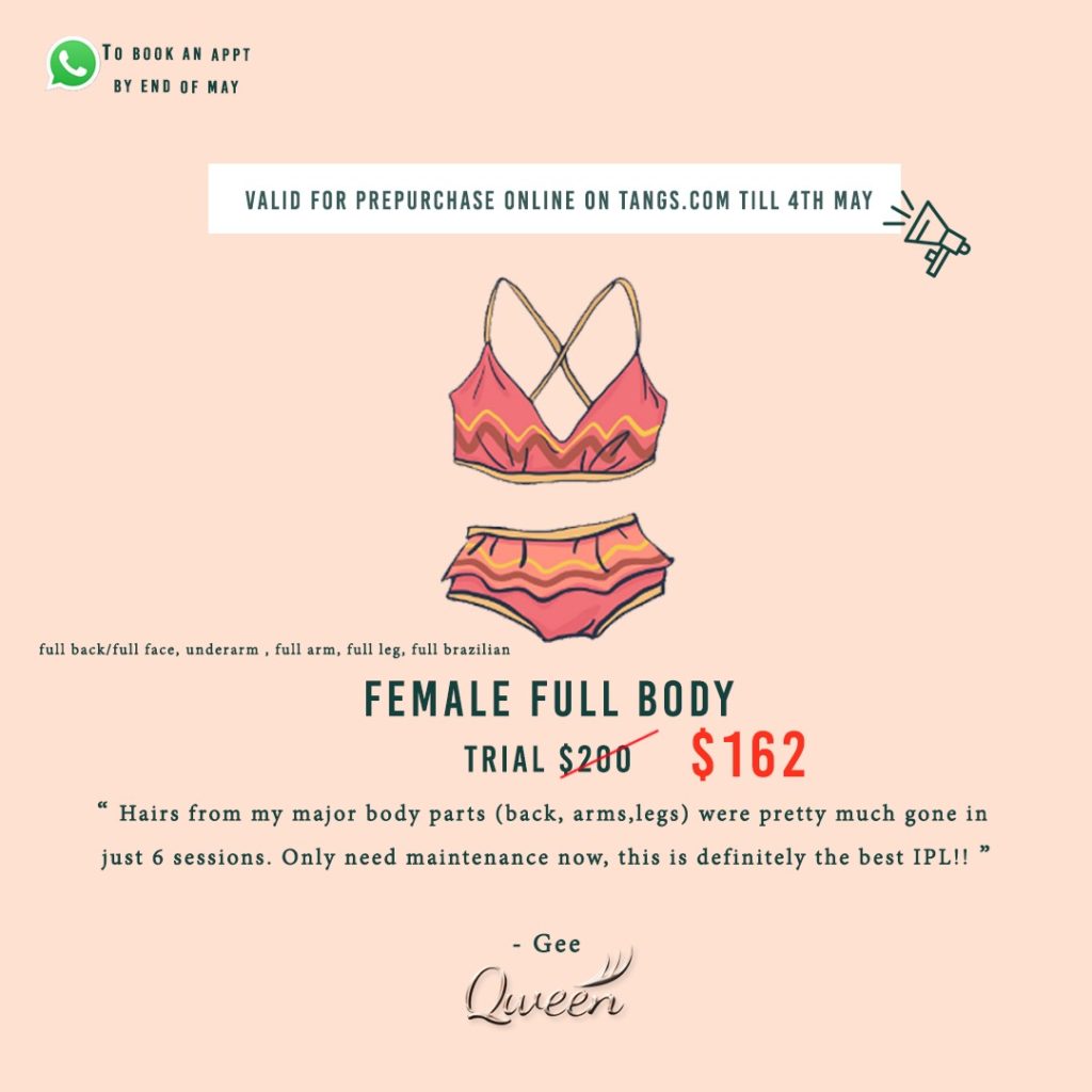 look no further, Qween is where you will never look back on those bushes down south, or even those unsightly upper lip hair/ stubby cheeks, or even those pimply back (yes, IPL removes those scars and clears your back), and even those really hairy legs and its ingrown which you been hiding under those pants for a long time to come.