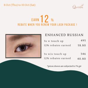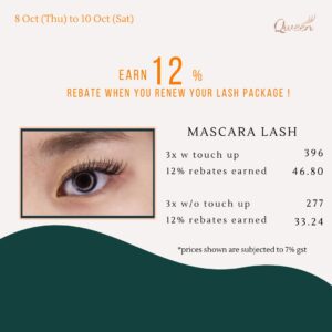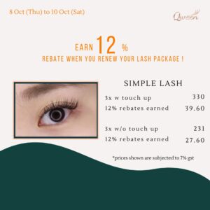 Simple lash with touch up- https://www.tangs.com/product/10-off-qween-3x-simple-lash-extension-package-with-3-touch-up-within-20-days?r=b-1408